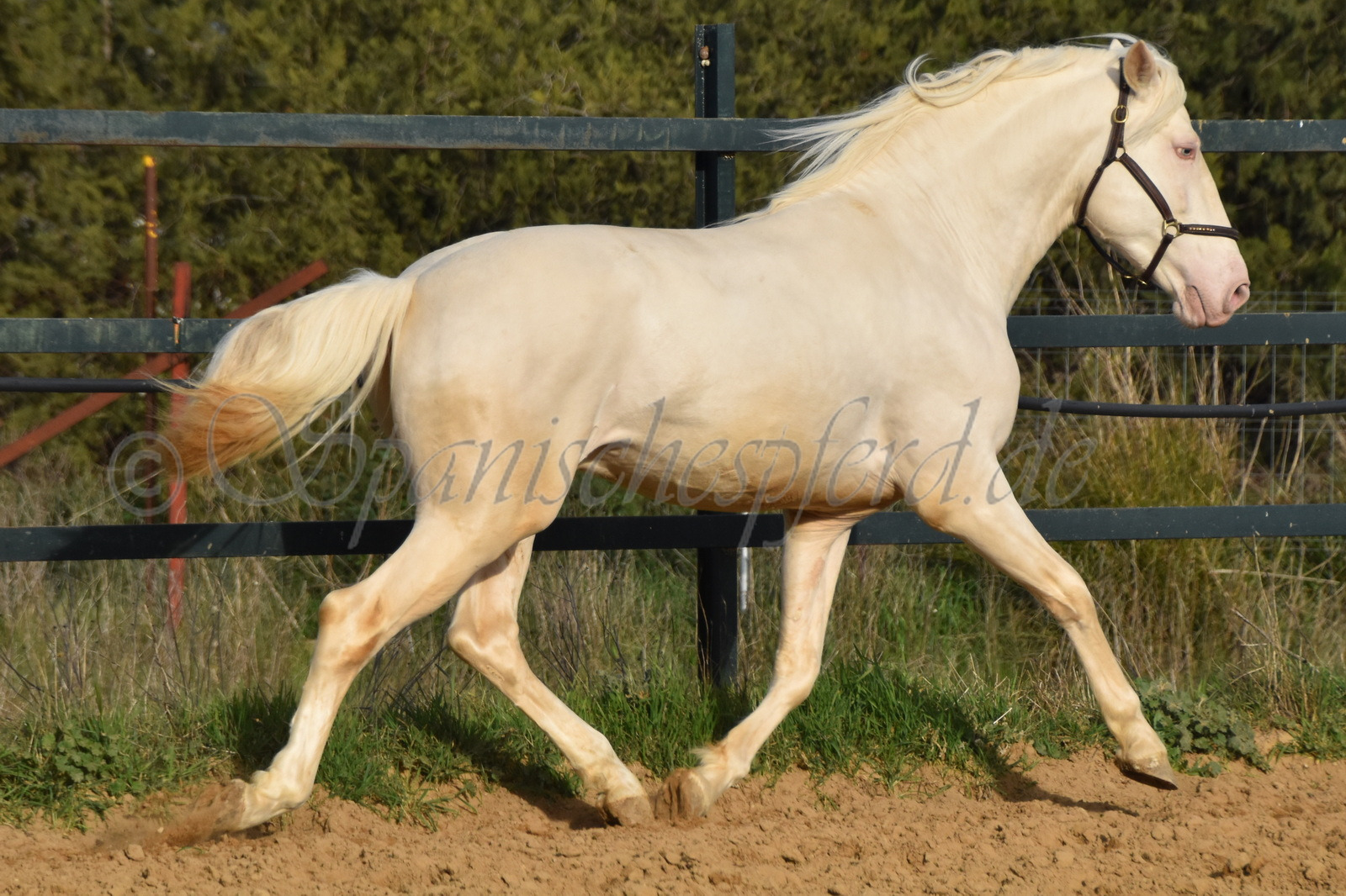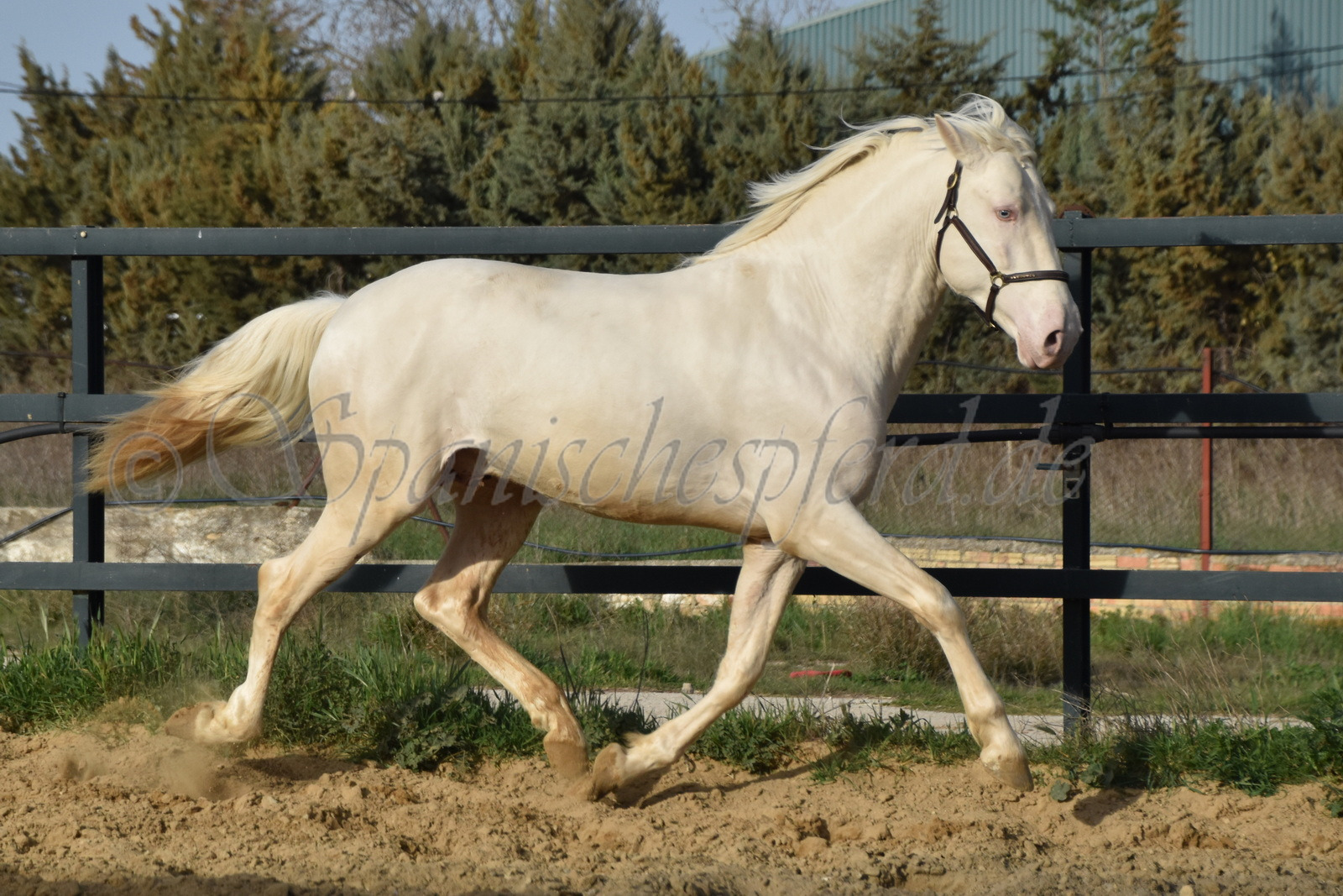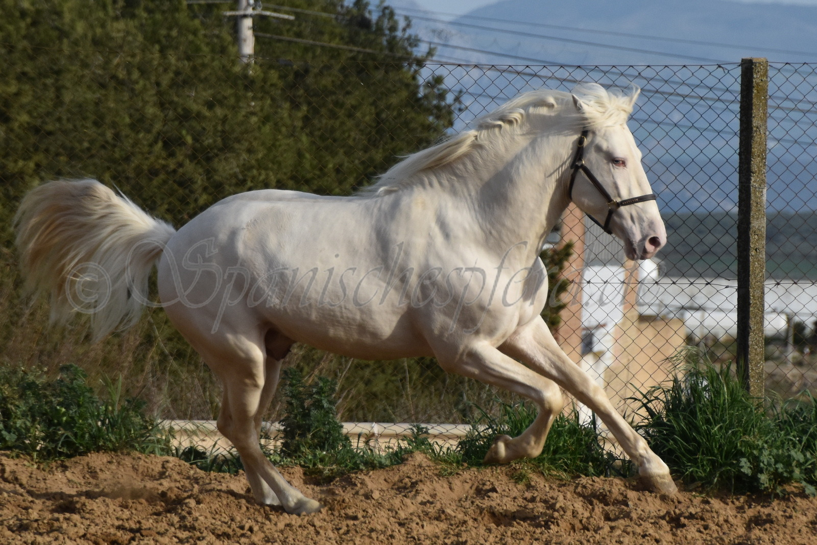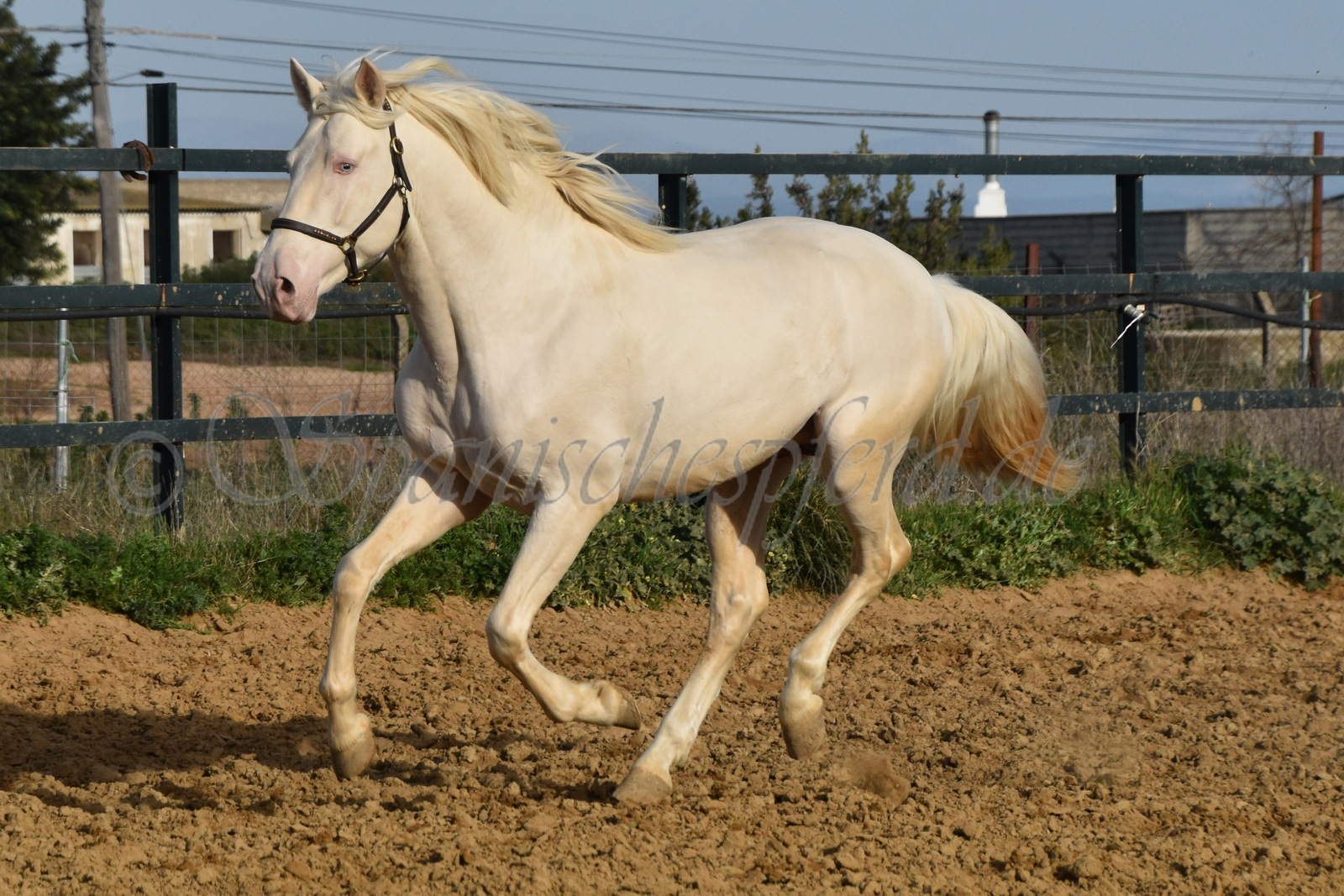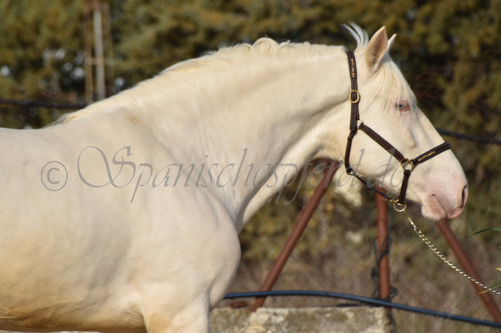 barocker, kräftiger und sehr lieber und freundlicher Andalusierhengst, Cremello mit blauen Augen, Stockmass 1,64, geboren 2021, bisher noch roh, aber sehr kooperativ und menschenbezogen, keine Hengstmanieren, kennt das Jungpferde – ABC und hat einen klaren und liebenswerten Charakter, super Bewegungen mit enormen Raumgriff, ruhiger Typ.