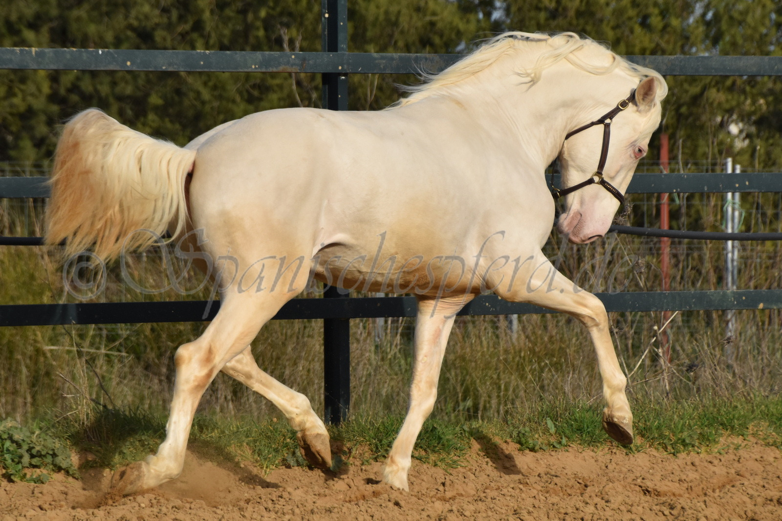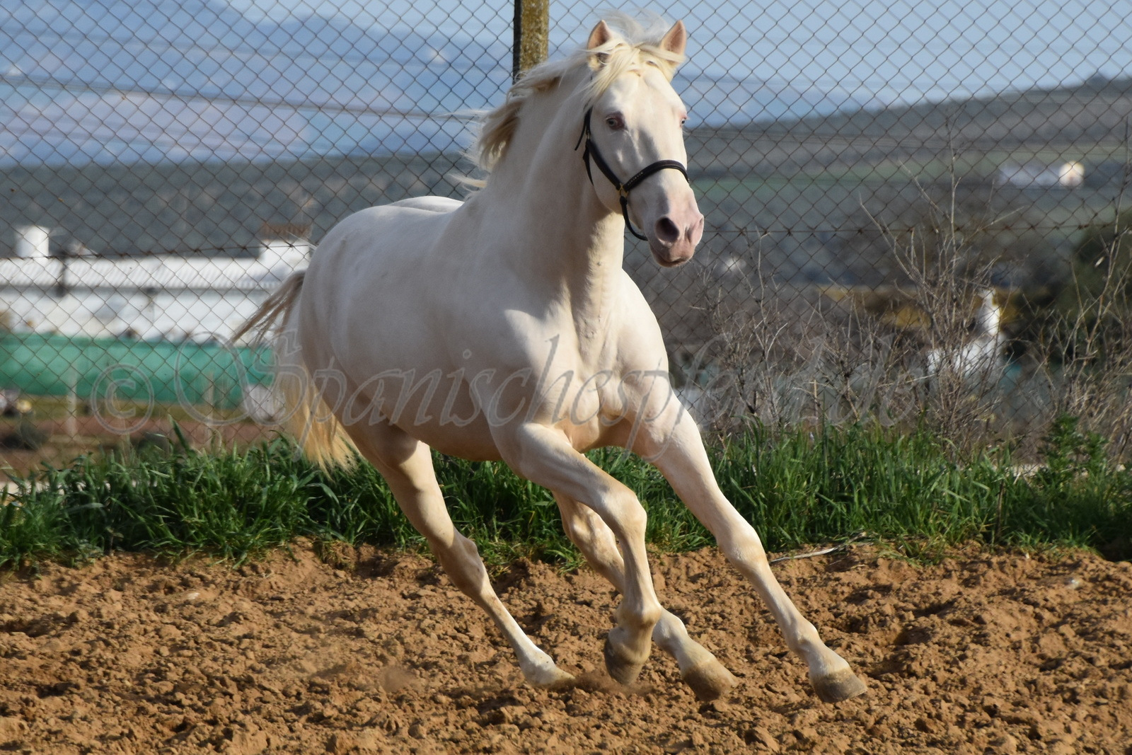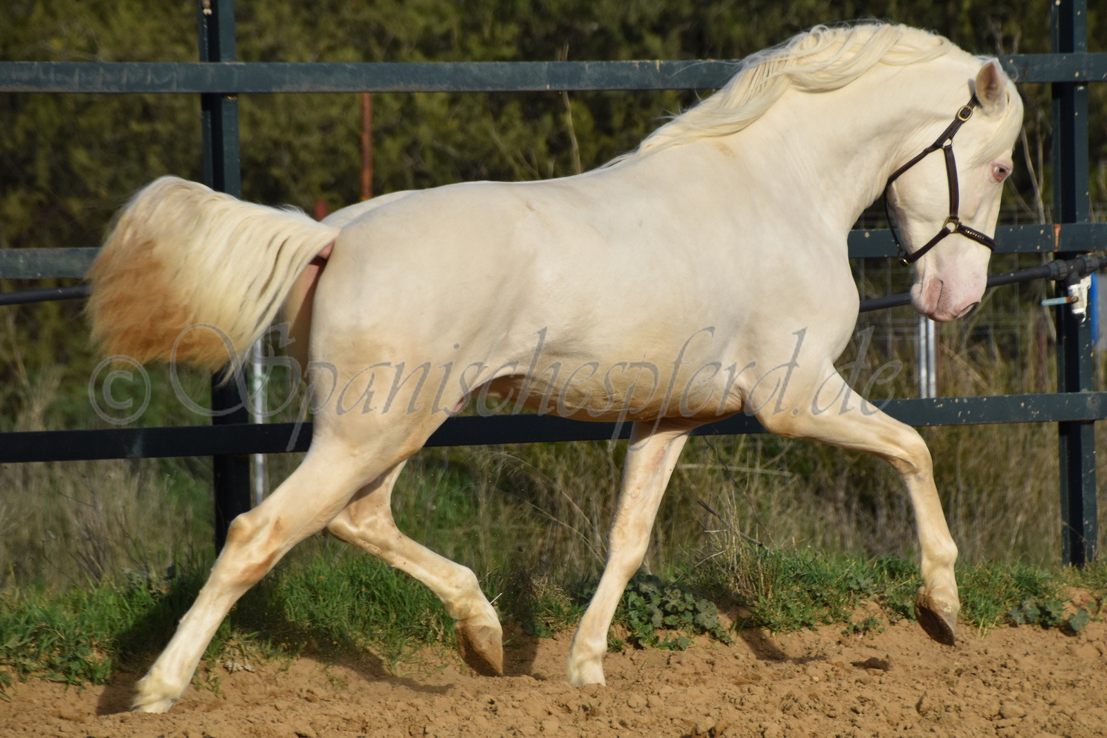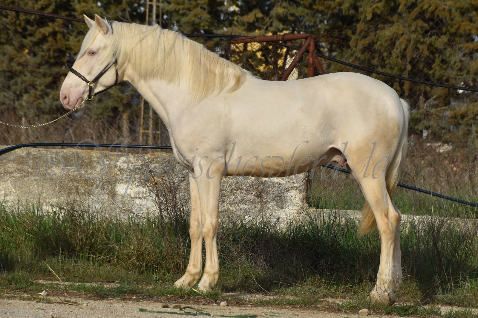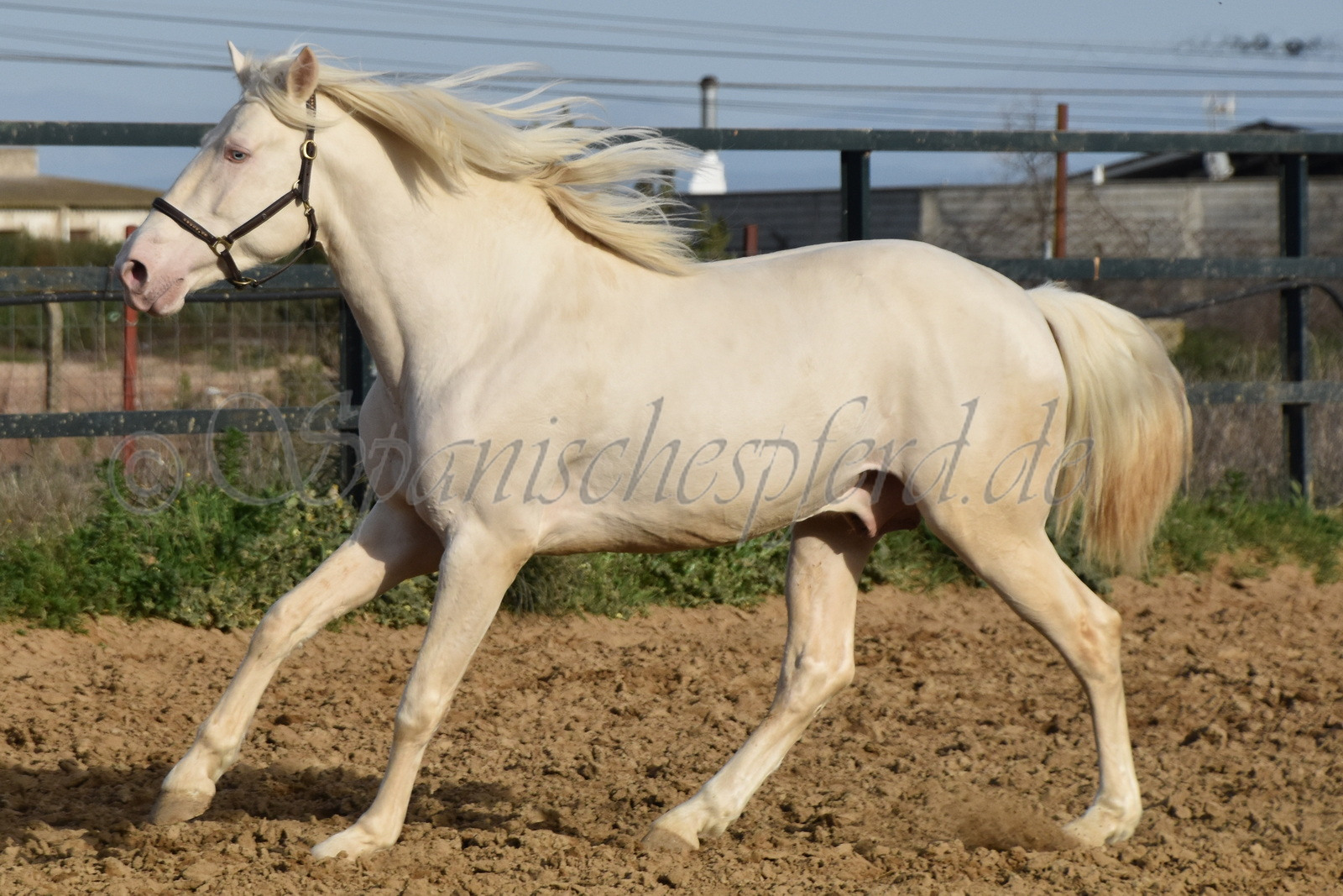 barocker, kräftiger und sehr lieber und freundlicher Andalusierhengst, Cremello mit blauen Augen, Stockmass 1,64, geboren 2021, bisher noch roh, aber sehr kooperativ und menschenbezogen, keine Hengstmanieren, kennt das Jungpferde – ABC und hat einen klaren und liebenswerten Charakter, super Bewegungen mit enormen Raumgriff, ruhiger Typ.